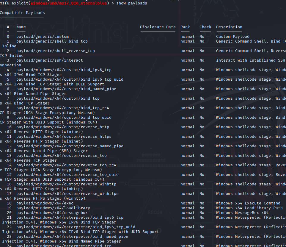 出现host is likely vulnrable to ms17-010表示大概率存在漏洞。然后我们再使用0模块攻击,命令为use 0,然后我们在输入show payloads来查看有效载荷。