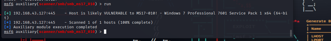 这里我们可以看到有五条内容,其中exploit模块是攻击脚本的利用模块,auxiliary是辅助模块用来扫描漏洞是否存在,或者是收集一些信息的,所以我们先要用auxiliary模块来看看是否该win7存在永恒之蓝漏洞,再使用exploit模块进行一个攻击。
