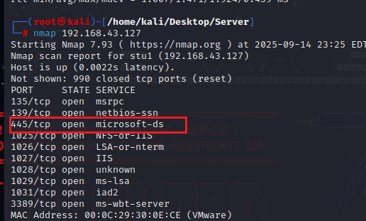 这里我们看到,win7和Kali发送的包一个没丢,表示现在kali和win7连通性良好,所以我们执行下一步操作。我们先用Kali中的nmap工具来探测win7是否开放了445端口(不会用nmap等工具的我后续也会出相关教学)