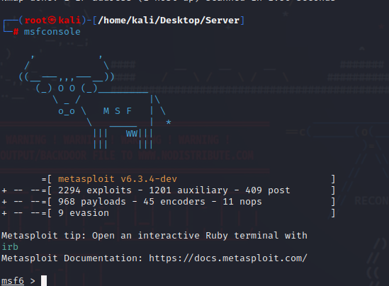 好,我们继续操作。在kali中输入msfconsole进入控制台。