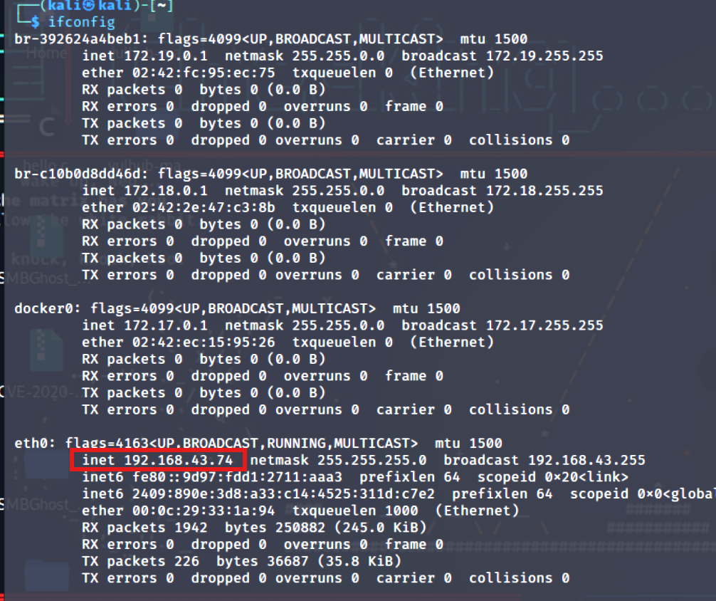 首先我们要看我们这两台机器是否连通,那么就用这两台机器互相ping一下彼此。所以我们得先看一下两台机器的IPV 4地址。首先在Kali中输入ifconfig命令查看Kali的地址,见下图圈住的部分