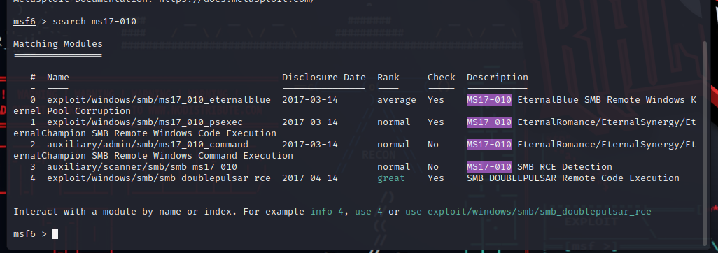 搜索我们要打的永恒之蓝漏洞,它的编号是ms17-010,所以在Kali中输入search ms17-010
