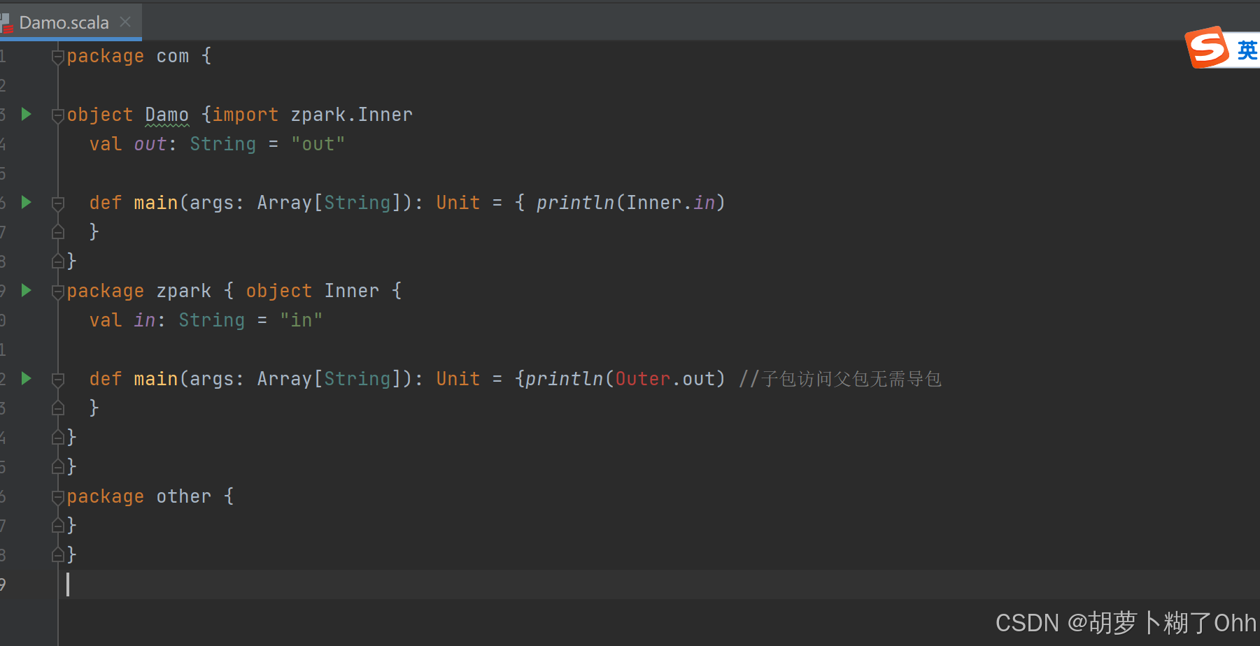 Scala 包的三大作用(和 Java 一样):区分相同名字的类、当类很多时,可以很好的管理类、控制访问范围