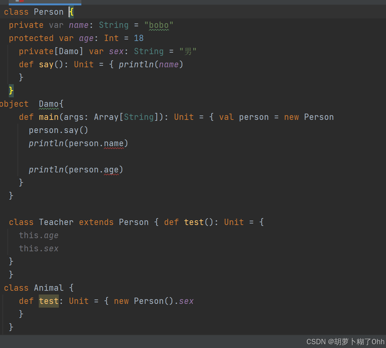 protected 为受保护权限,Scala 中受保护权限比 Java 中更严格,同类、子类可以访问,同包无法访问。