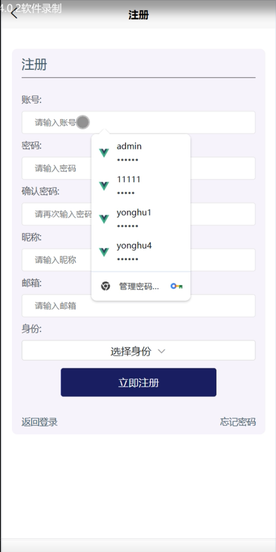 下表是注册功能测试用例,检测了各种数据的输入情况,观察系统的响应情况。得出该功能达到了设计目标。