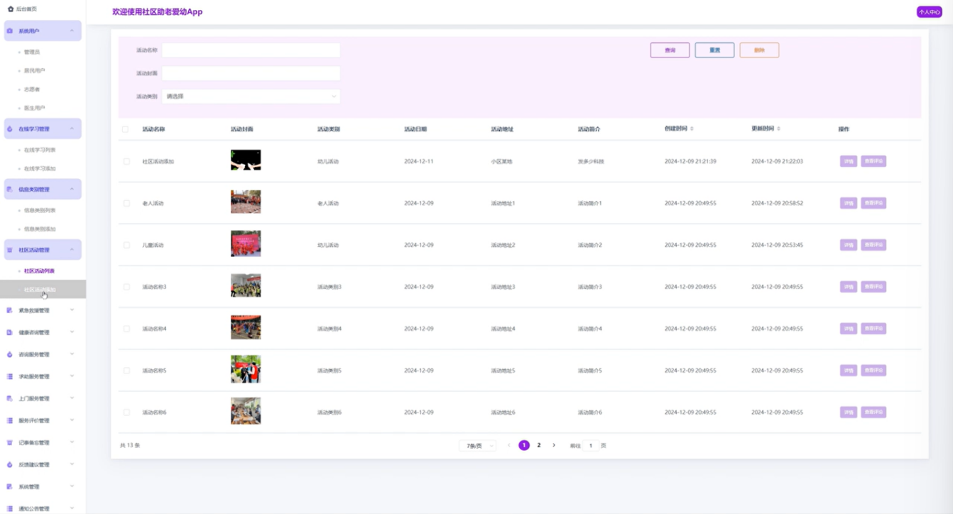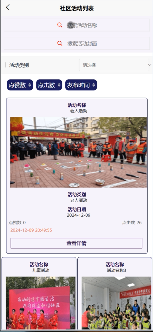 社区活动:展示即将举行的社区活动,用户可以查看活动详情、报名参加,并了解活动的相关信息,促进居民参与社区生活。