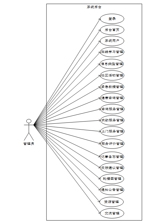 系统主要包括居民用户、医生用户、志愿者用户和管理员四大角色,每个角色具备不同的功能模块。居民用户可以通过App获取健康咨询、参与社区活动、进行在线学习及寻求生活帮助,增强社区参与感和归属感。医生用户则可以提供专业的健康咨询、参与社区活动,并进行在线学习,提升专业技能。志愿者用户通过App参与社区服务,提供上门帮助,促进社区互助精神。管理员则负责系统的管理和维护,包括用户管理、活动组织和服务评价,确保系统的高效运行。
