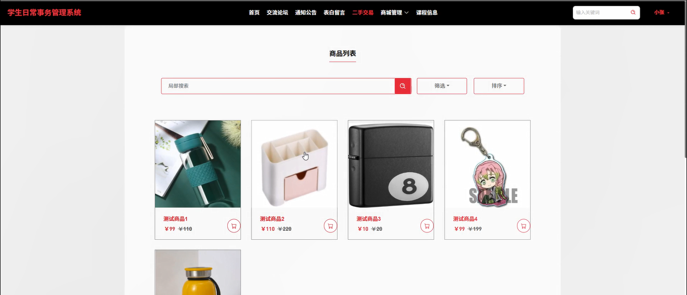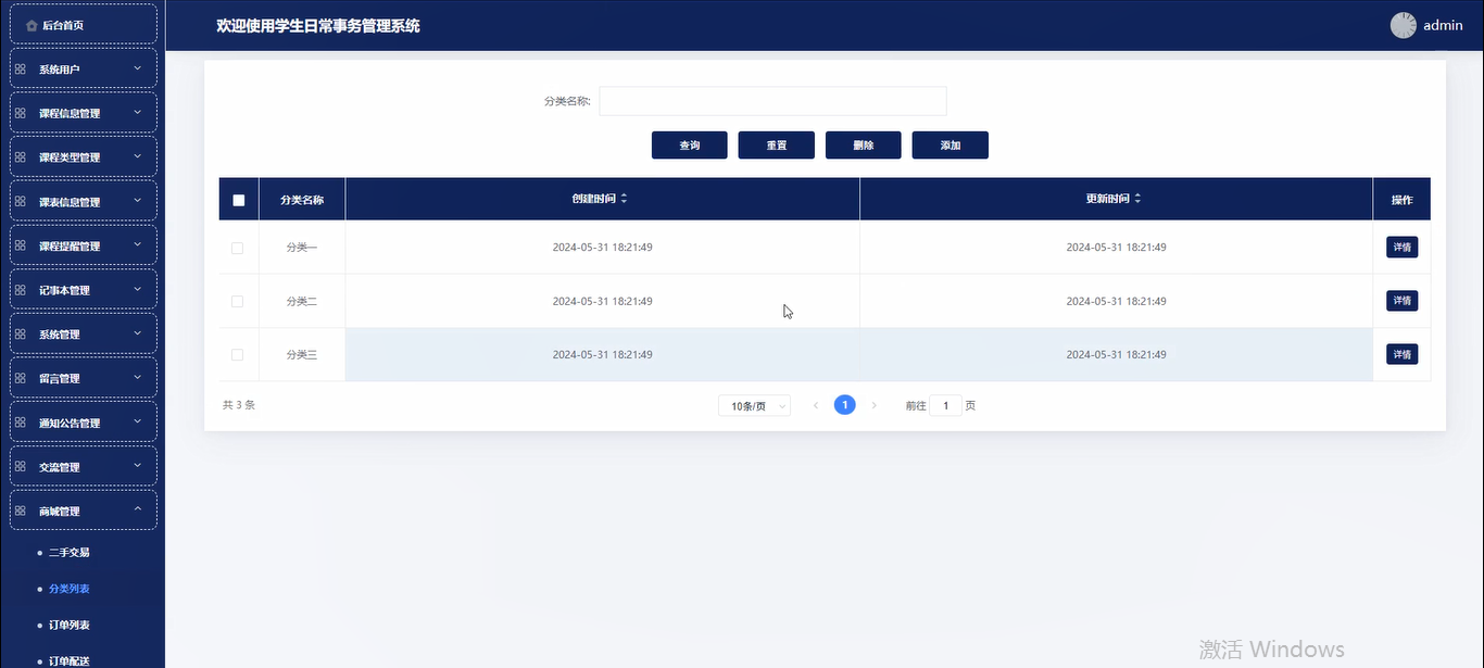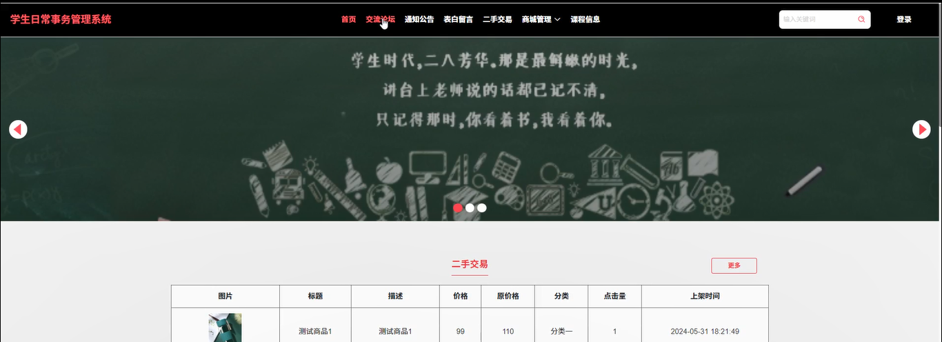 (1)后台功能:学生用户后端功能可以查看后台首页、课程信息管理、记事本管理、留言管理、交流管理和商城管理。商城管理功能包括能添加二手交易商品、商品分类列表,查看订单列表和管理订单配送状态。