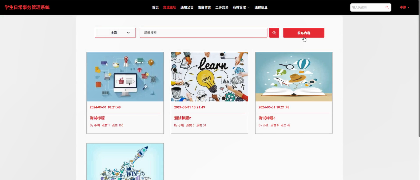 本研究旨在设计并实现一个基于Spring Boot和Vue的学生日常事务管理系统,通过将系统用户管理、课程信息管理、课程类型管理、课表信息管理、记事本管理、系统管理、留言管理、通知公告管理、交流管理以及商城管理等功能模块化、系统化,来优化高校的日常管理流程。该系统的开发不仅顺应了高校管理信息化的趋势,也为学校提供了一个能够持续改进和扩展的管理平台,满足未来的需求。