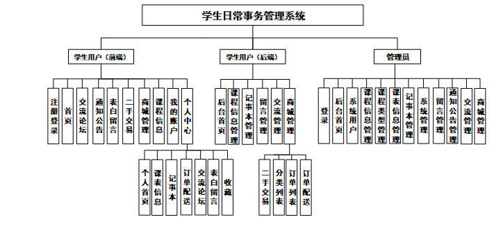 本学生日常事务管理系统按功能分为学生用户和管理员两种角色,具体功能如下: