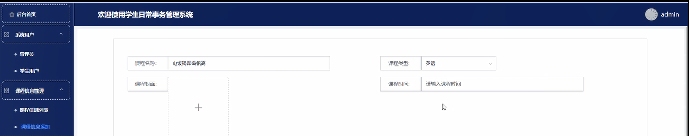 课程信息管理:管理员点击可查看课程信息列表和课程信息添加;点击“课程信息添加”,输入课程名称,选择课程类型,上传课程封面,输入课程时间、课程地点、教师工号、授课教师,上传课表附件和添加课程介绍。界面如下图所示。