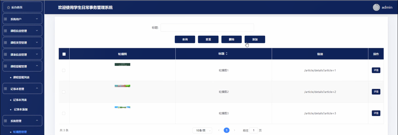 (7)系统管理:管理员可以对系统前台展示的轮播图进行增删改查,方便用户进行查看。