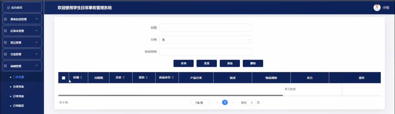 学生用户后端功能可以查看后台首页、课程信息管理、记事本管理、记事本管理、留言管理、交流管理和商城管理。商城管理功能包括能添加二手交易商品、商品分类列表,查看订单列表和管理订单配送状态。