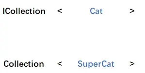 既然SuperCat是Cat的子类,那么Collection中的任意一个SuperCat对象都应该可以安全转化为Cat对象,那么SuperCat的集合也应该视为Cat的集合。从事实上讲,若对任何一个需要Cat对象集合的方法,即便传入的是一个SuperCat对象的集合也应该可以正常工作。同样以类型为ICollection<Cat>的接口变量cats的视角来看,ICollection<Cat>类型上本来应该为Cat类型的地方现在被SuperCat类型所替代: