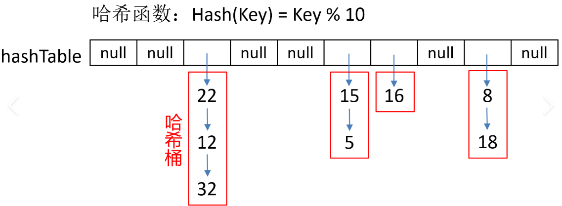 存储的值被一个个的挂在下面,所以又称哈希桶
