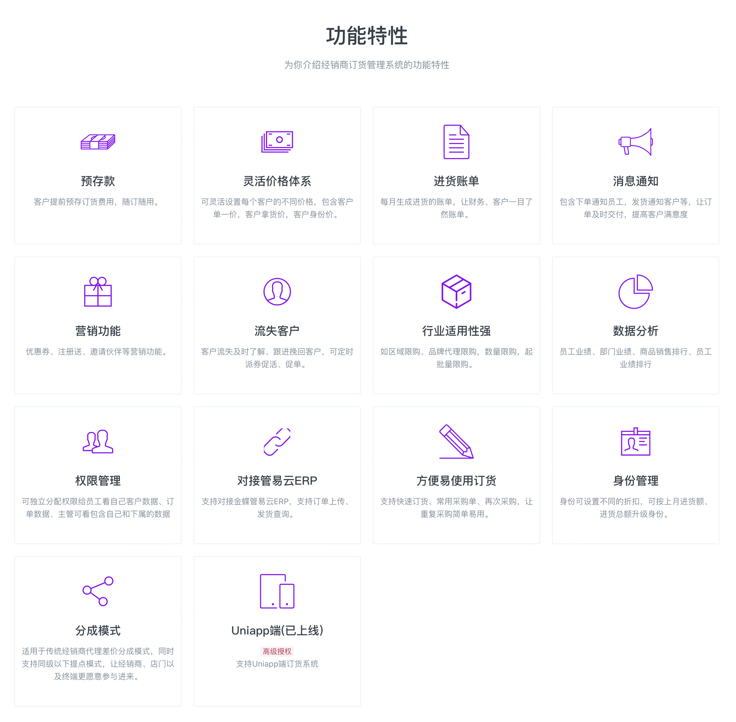 订货管理系统,适用于经销商订货、连锁加盟门店订货、批发贸易订货等。为连锁型品牌、商贸批发类或工厂企业客户提供支持业务模式的分成数字化营销方案。提供前后端无加密源码,独立部署,不受限制。