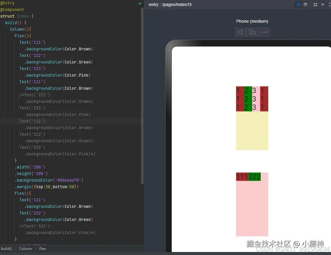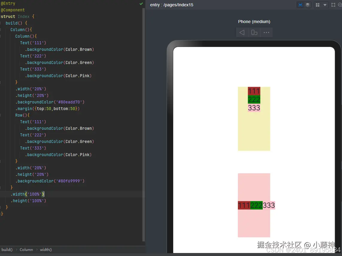 column组件里面的子元素会垂直排列,且默认居中显示; row组件里面的子元素会水平排列,且从最左边开始排列显示。