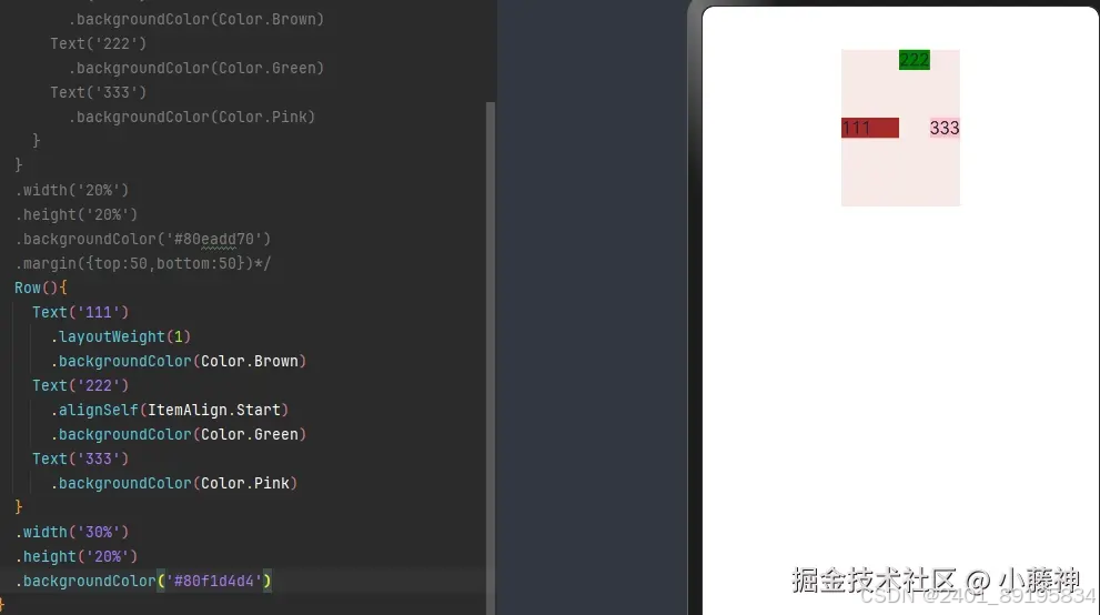 单个子元素交叉轴对齐方式.alignSelf(ItemAlign.枚举值)+自适应缩放.layoutWeight()