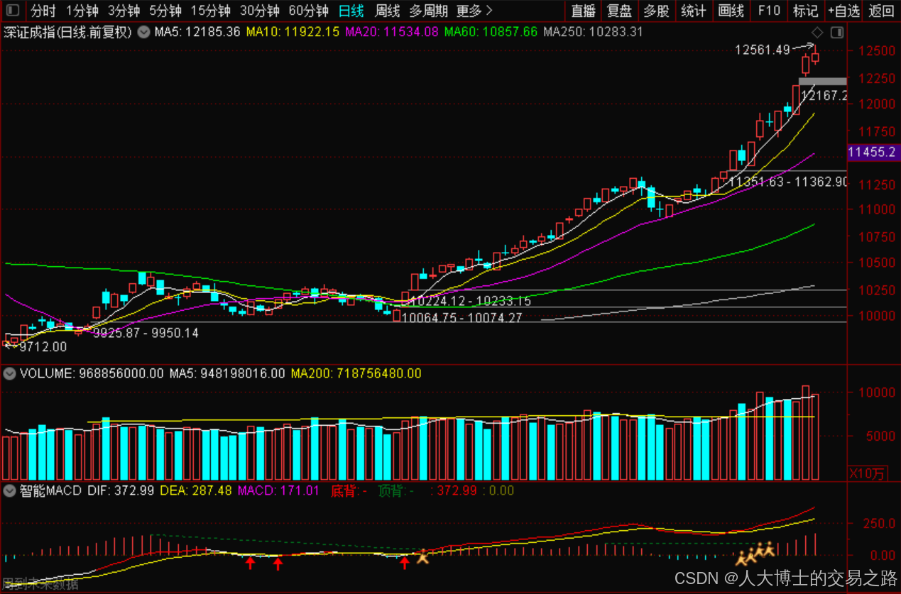 深证指数今天收阳线,量能依然维持在5天均量线附近,日内高点12561.49,目前指数依然是多头趋势,小级别暂未出现反转信号,但需要注意高低切换的风险。