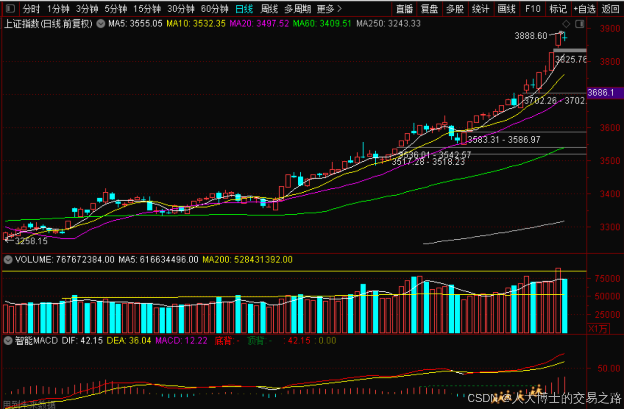 上证指数今天缩量到5天均量线附近,日内高点3888.60收十字星,目前均线多头趋势明显,短期有加速迹象,注意短期震荡调整的风险;个股今天上涨稍多于下跌。