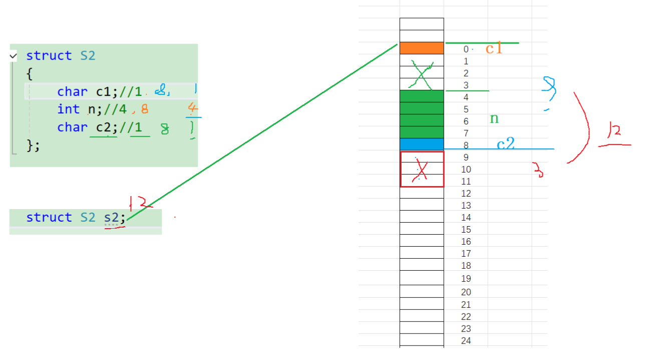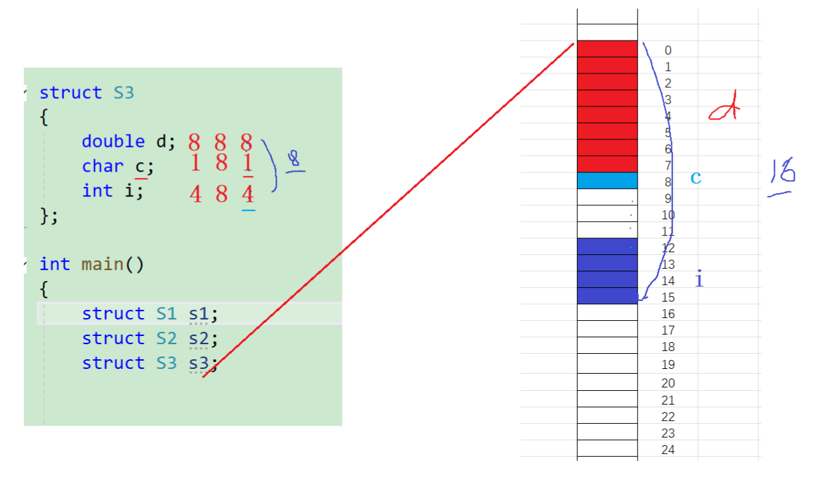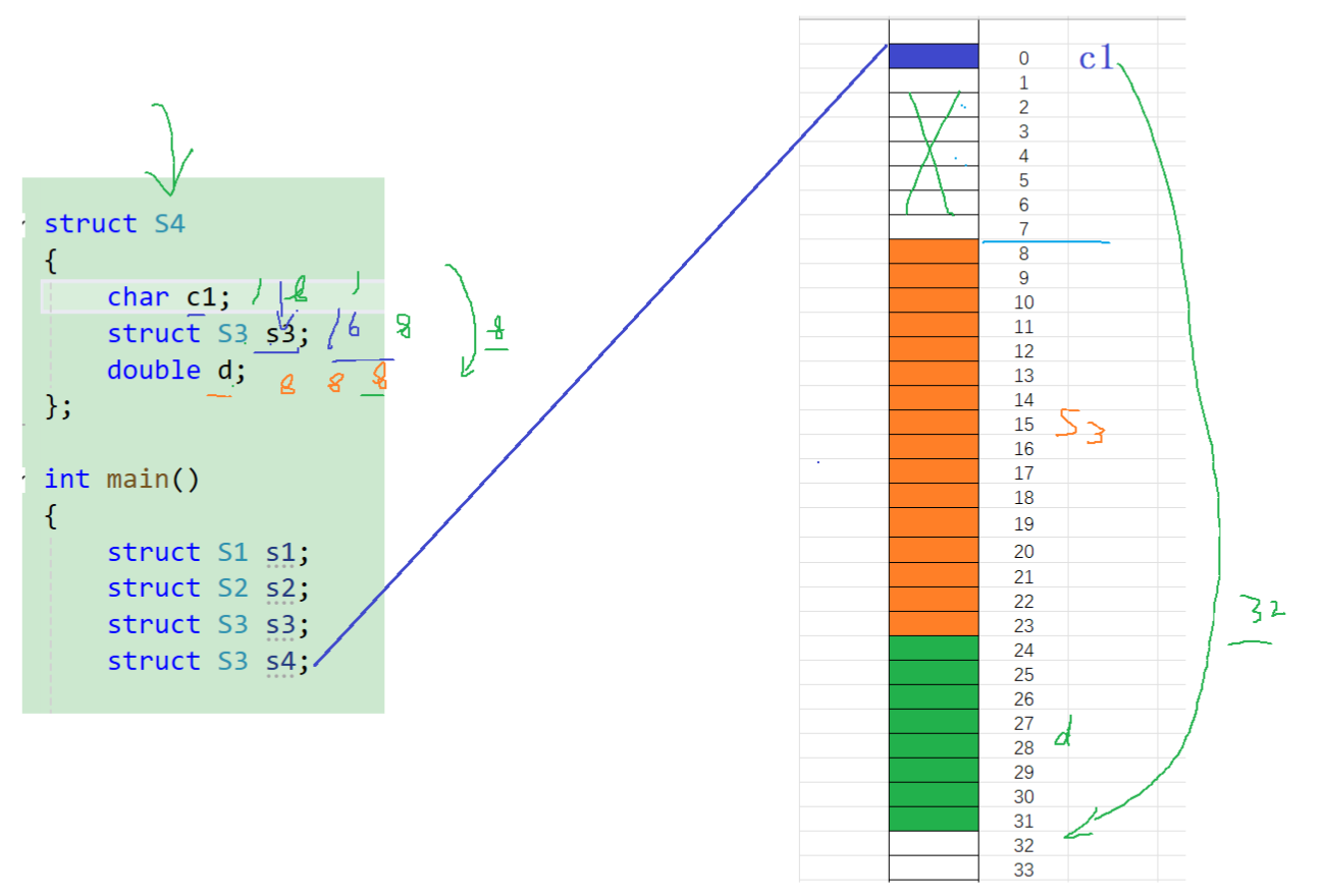 4、如果嵌套了结构体的情况,嵌套的结果体成员对齐到自己的成员中最大对齐数的整数倍处,结构体的整体大小就是所有最大对齐数(含嵌套结构体中成员的对齐数)的整数倍。