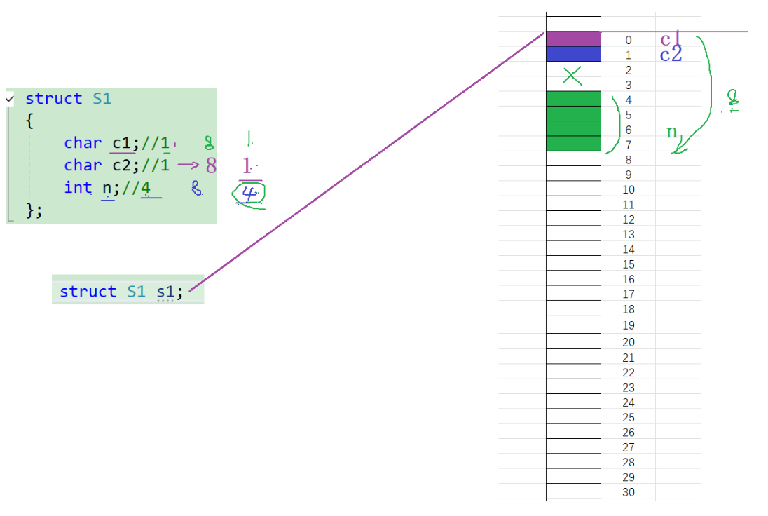 1、结构体的第一个成员对齐到和结构体变量起始位置偏移量为0的地址处;