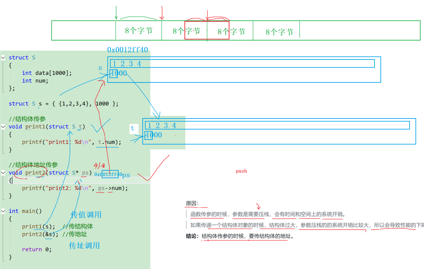 2、如果传递一个结构体对象的时候,结构体过大,参数压栈的系统开销会比较大,所以会导致性能的下降。