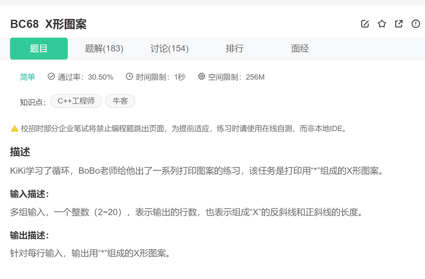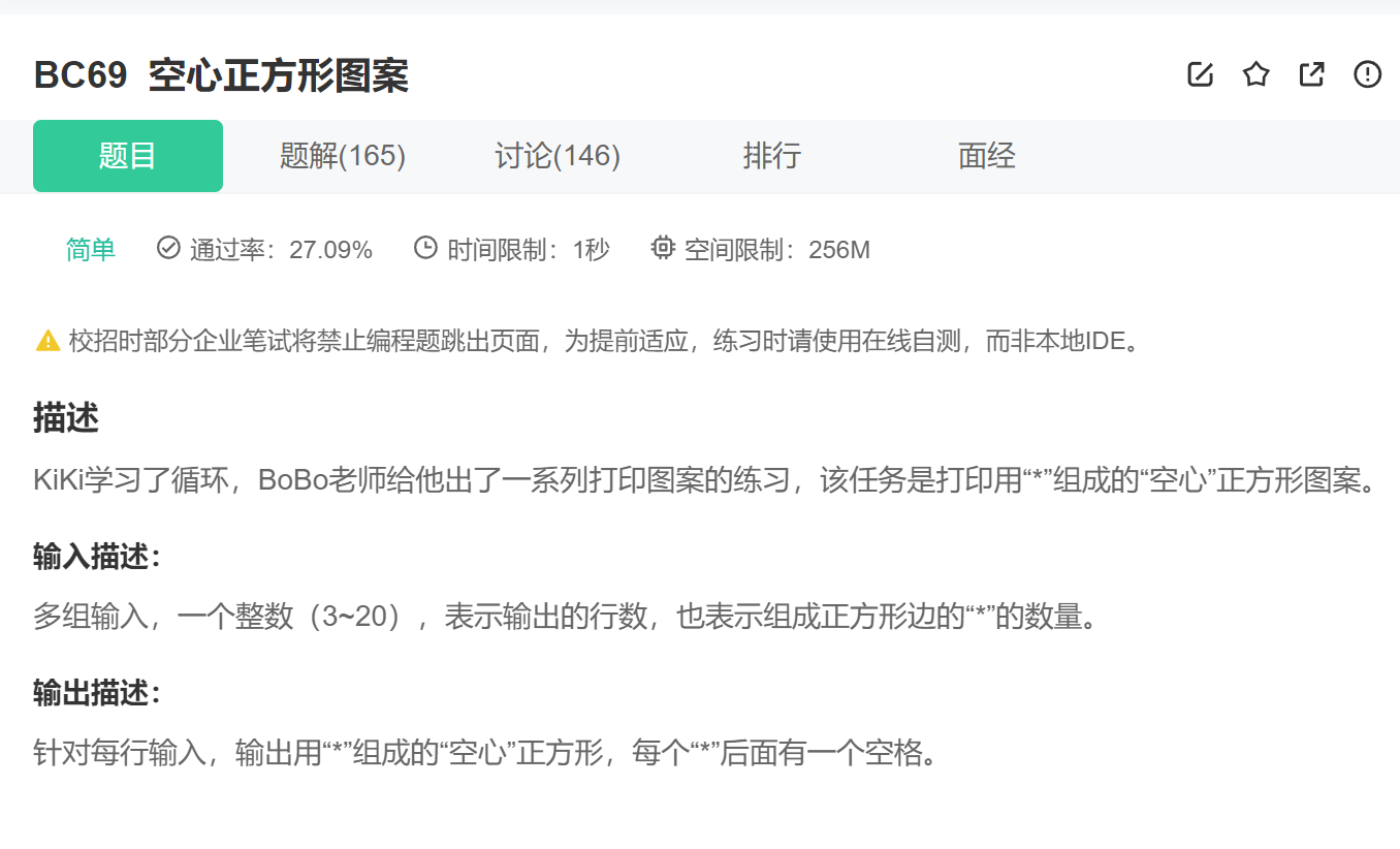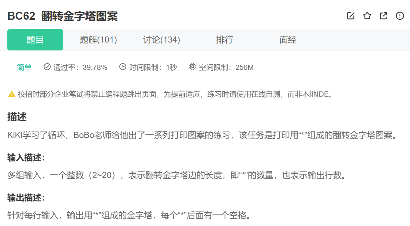 前言:上一篇博客又带大家刷了一些相对来说简单的代码题目,本篇文章我们将继续练习下面的题目。刷前提醒:从本文开始会有大量图案打印题,有的题目挖了大坑,大家做的时候要留意,如果做不出来,看了代码演示后要自己多敲几遍,去理解代码的逻辑。