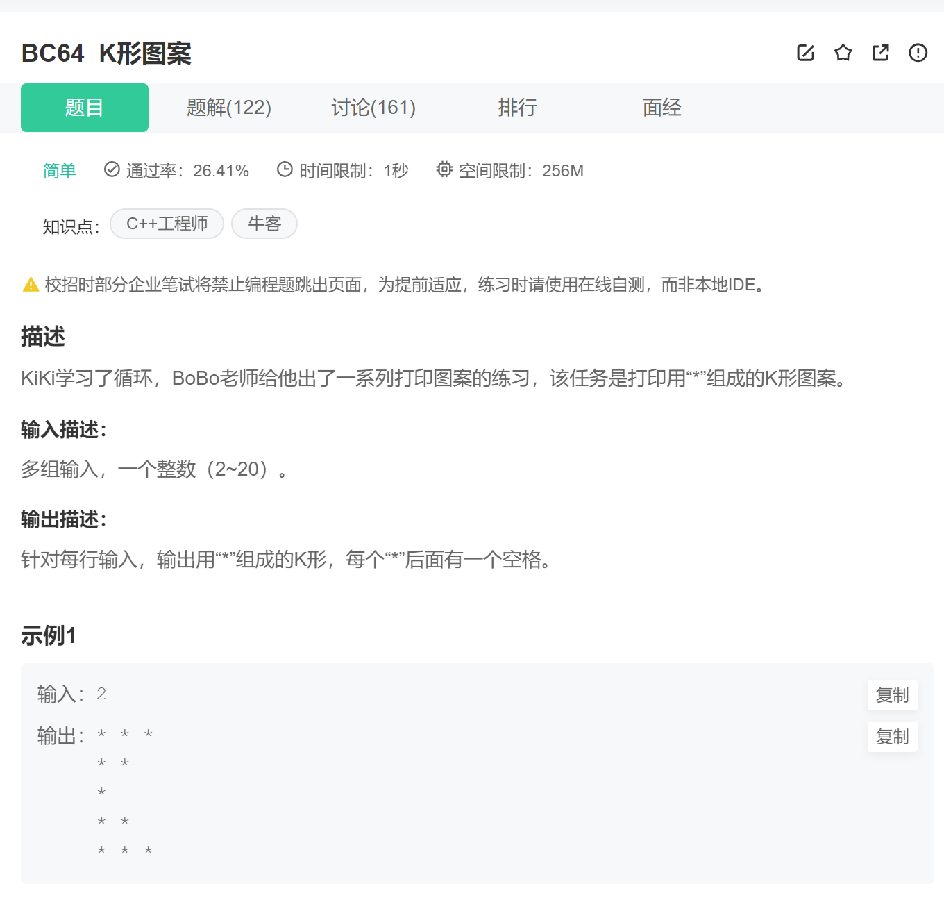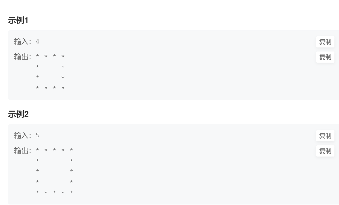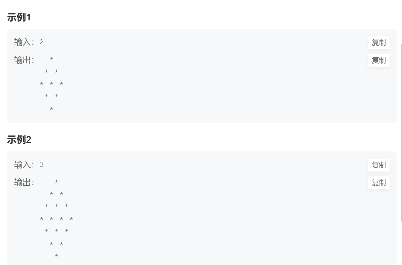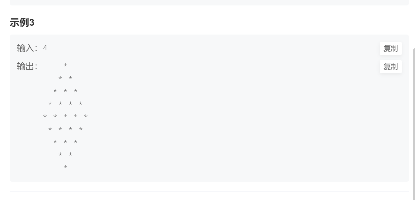 3、每一行的打印完,后边还有空格,可能牛客网的题目处理不严谨,在题目中也没提现,怎么都做不 出来,不过选中输出样例,会发现后边有空格。