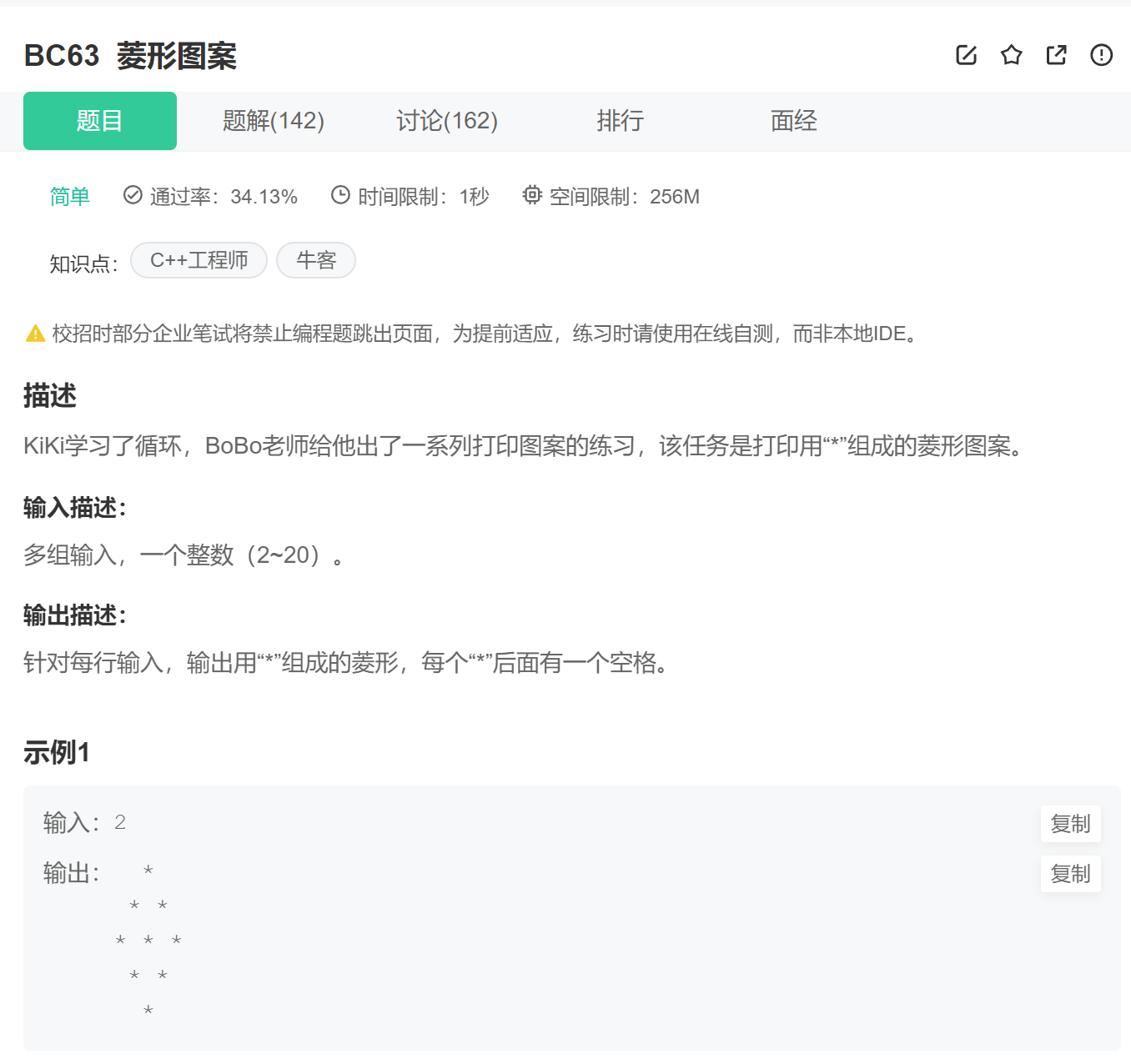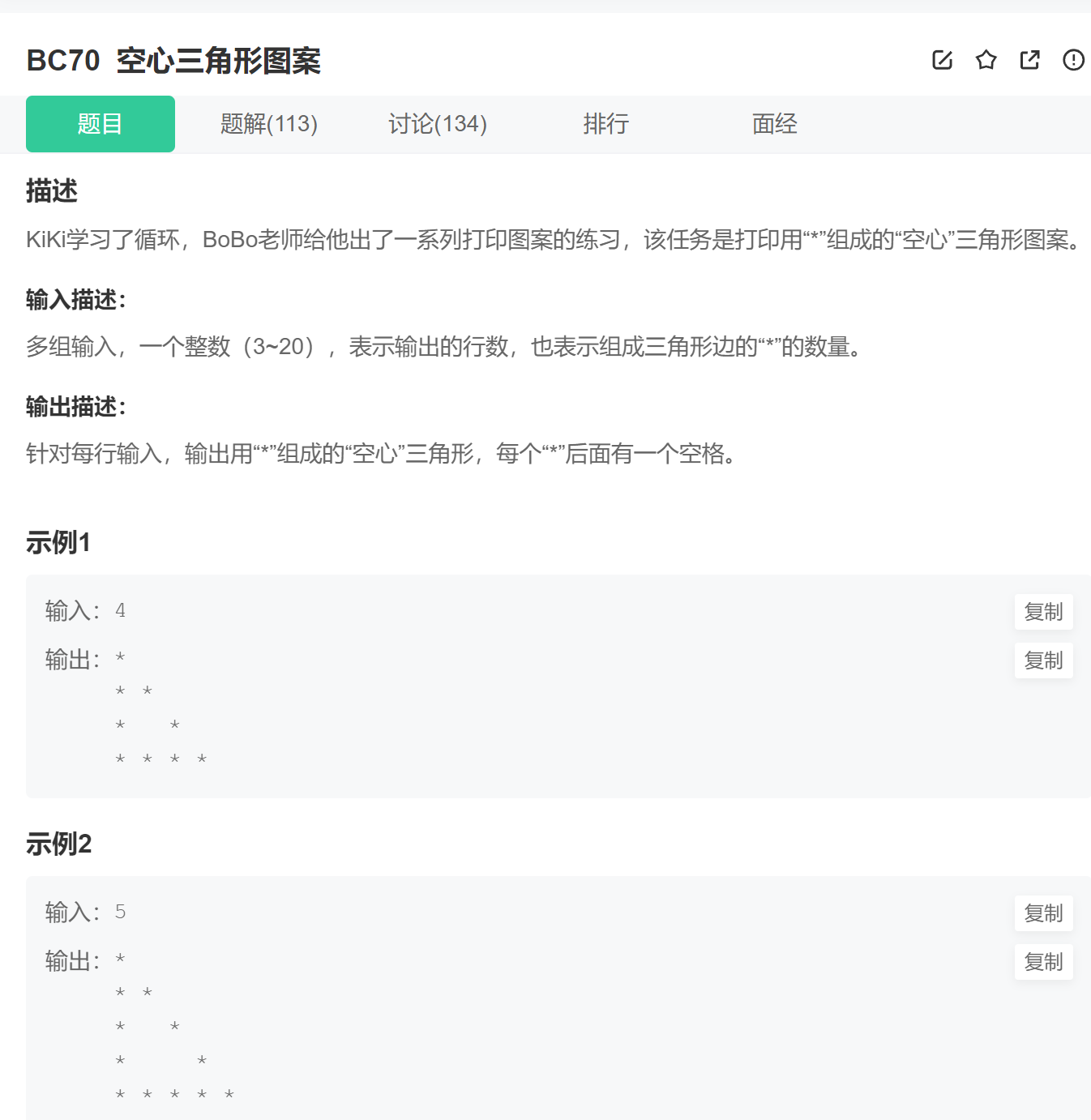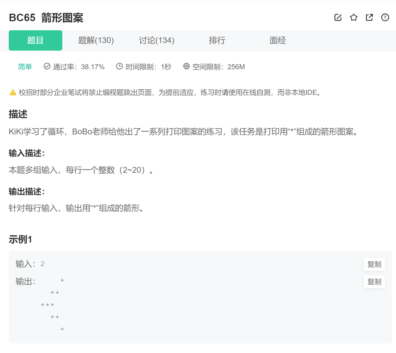 3、每一行的打印完,后边还有空格,可能牛客网的题目处理不严谨,在题目中也没提现,怎么都做不 出来,不过选中输出样例,会发现后边有空格。