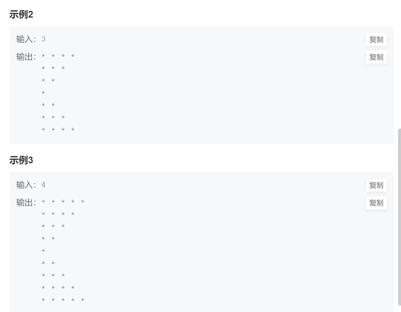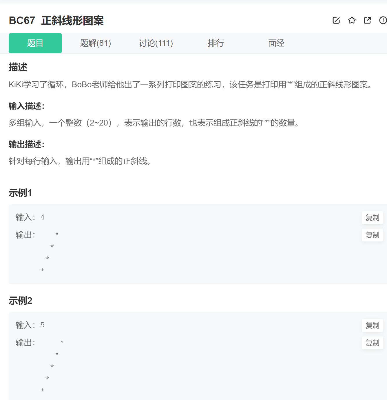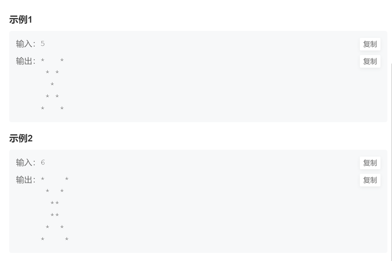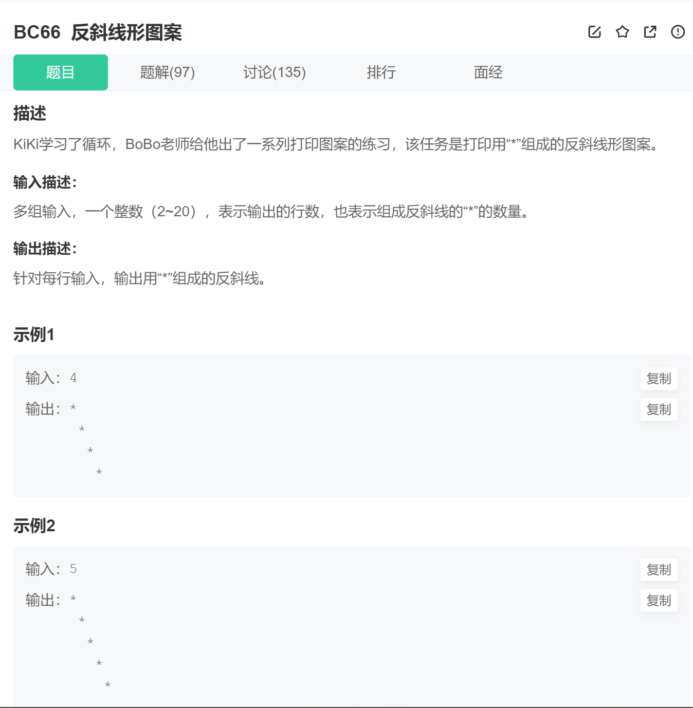 3、每一行的打印完,后边还有空格,可能牛客网的题目处理不严谨,在题目中也没提现,怎么都做不 出来,不过选中输出样例,会发现后边有空格。