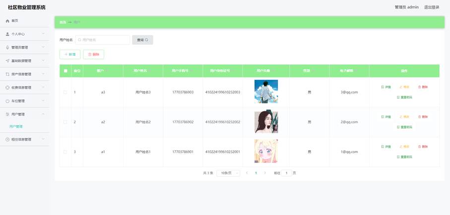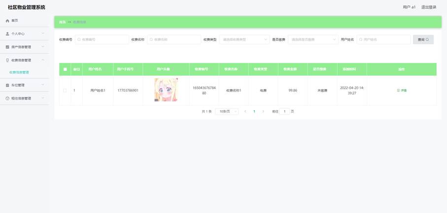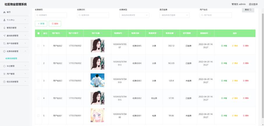 系统采用B/S架构,后端使用Spring Boot框架,前端采用Vue.js+Element UI,数据库选用MySQL 8.0。通过该系统,物业管理人员可以高效管理社区各项事务,业主可以方便地查询缴费信息、申请服务等。