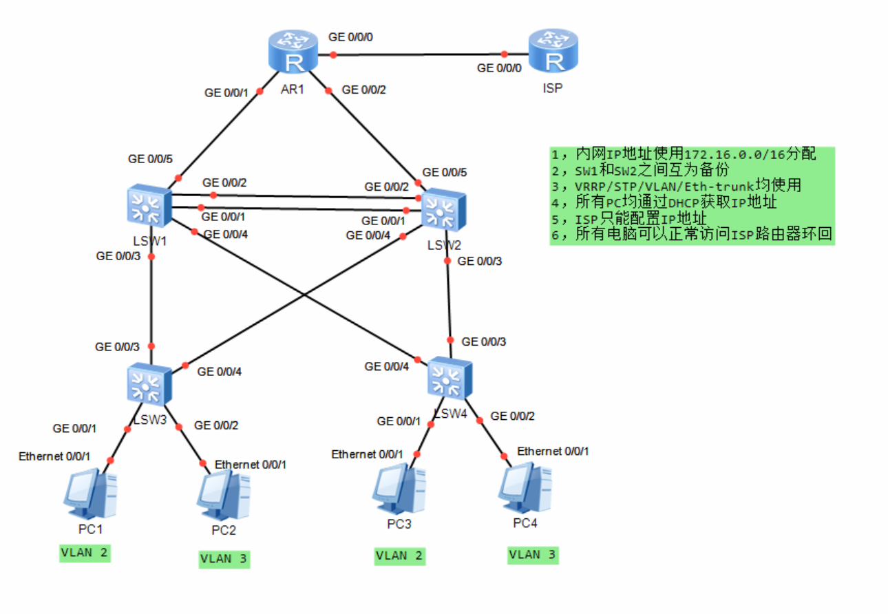 - 使用VRRP/MSTP/VLAN/eth-trunk等技术。