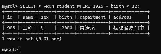 4. 从student表中查询年龄小于22岁的学生信息(假设当前年份为2025年)
