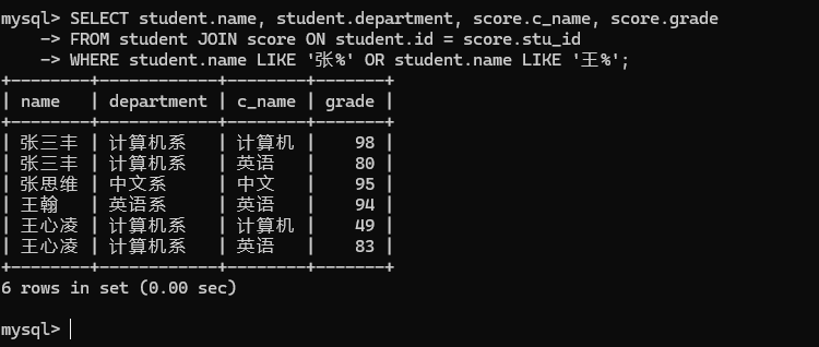 14. 查询姓张或者姓王的同学的姓名、院系和考试科目及成绩