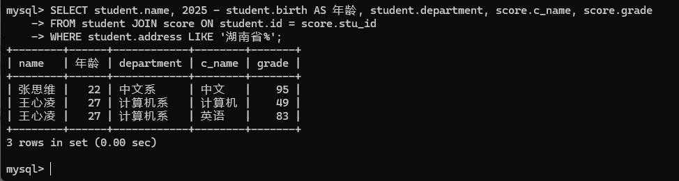 15. 查询都是湖南的学生的姓名、年龄、院系和考试科目及成绩(假设当前年份为2025年)
