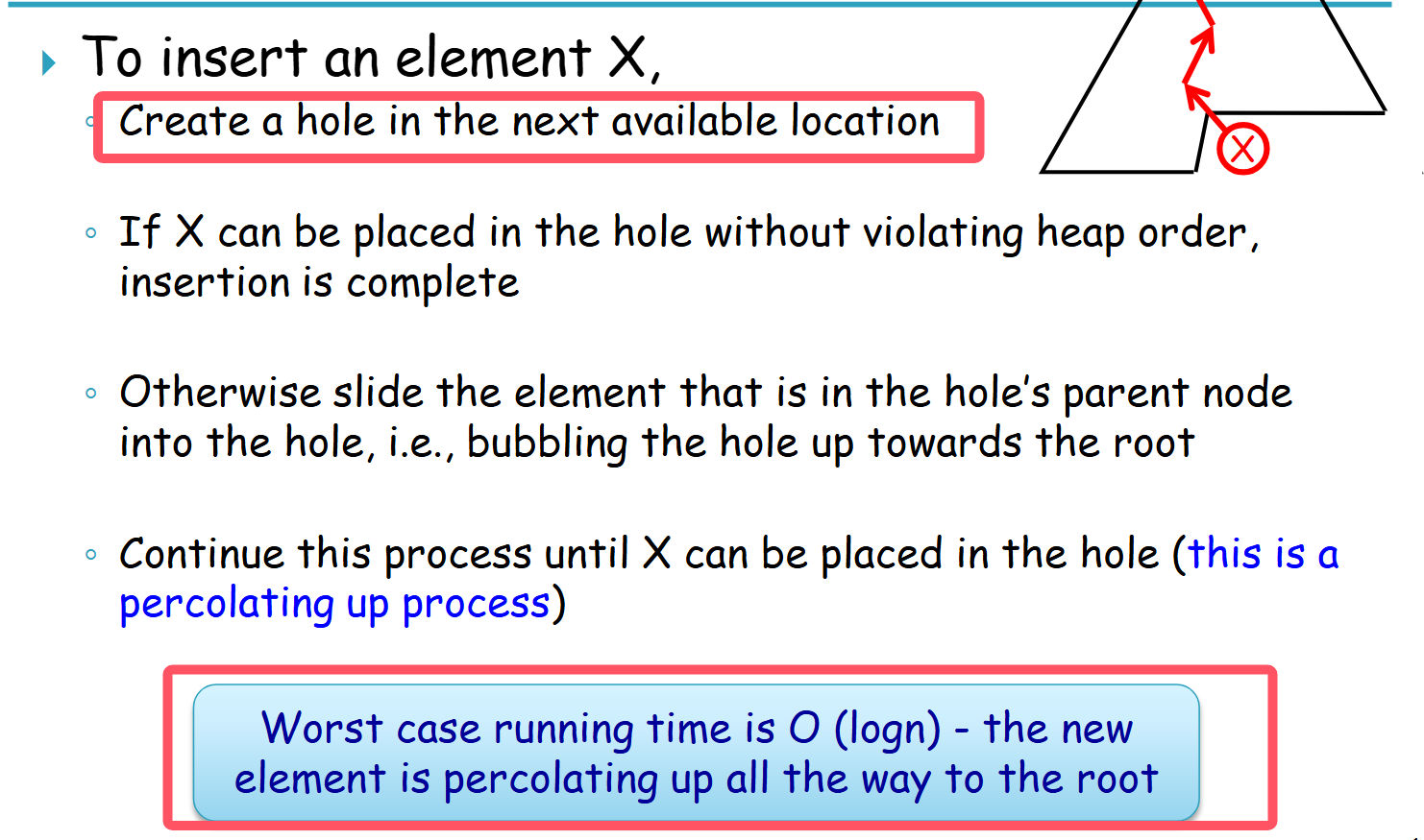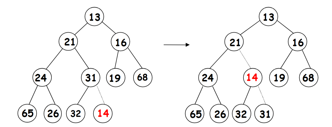 (如何insert?先插入最新的位置,然后在慢慢modify。将数字和parent比较,如果数字更小,那么就和parent交换位置。)