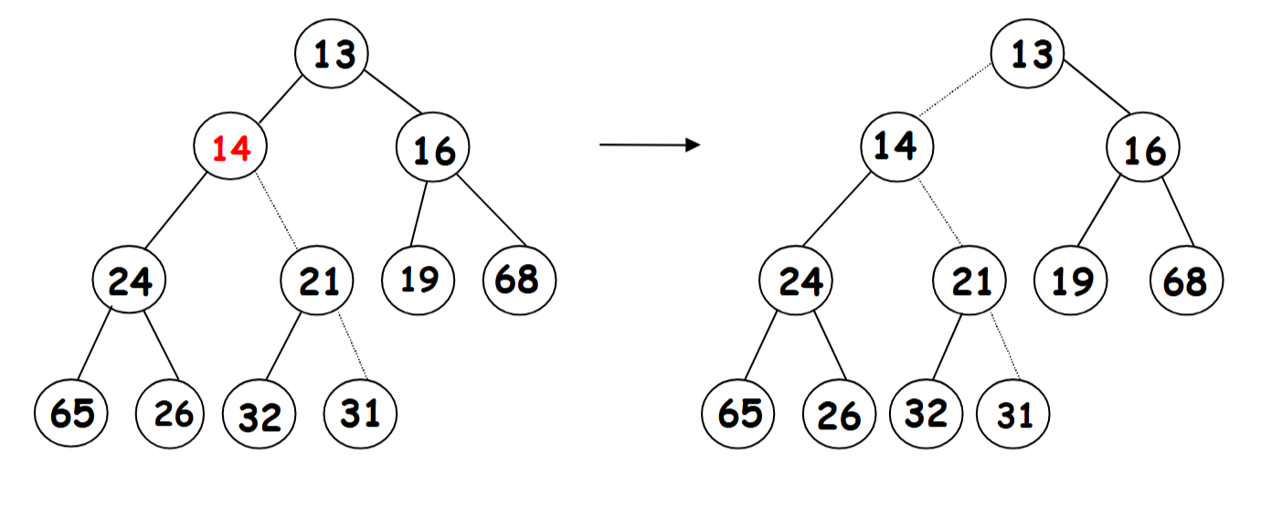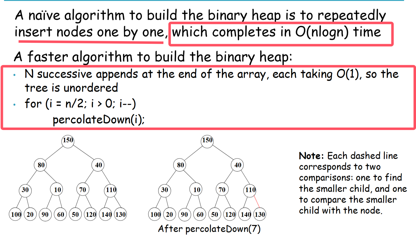 (delete min的思路:删除root,将最新的元素放到root,将root和两个孩子比较,交换:和最小的孩子。直到root小于两个孩子。)、
