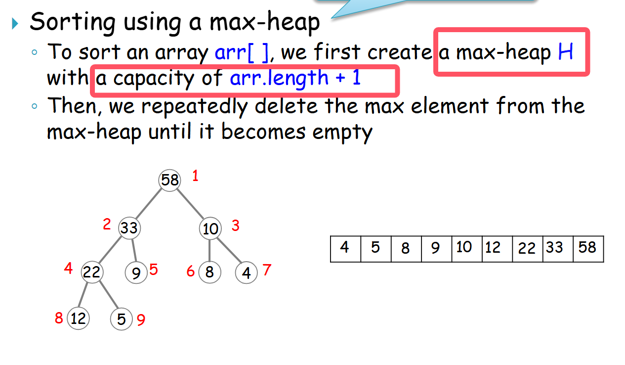 heap[] = [_, 58, 33, 10, 22, 9, 8, 4, 12, 5]注意:- 索引 0 的位置是空的(用