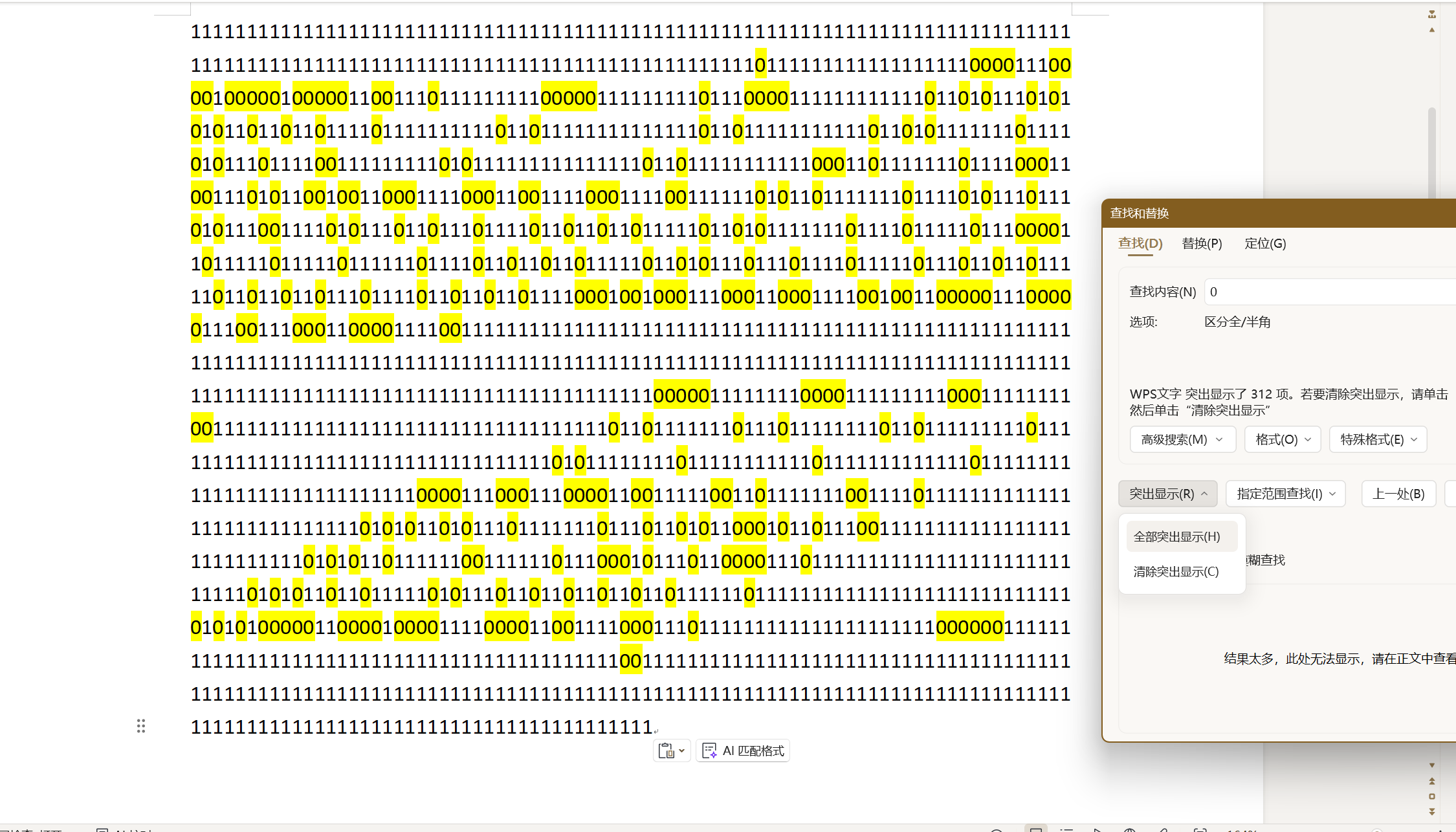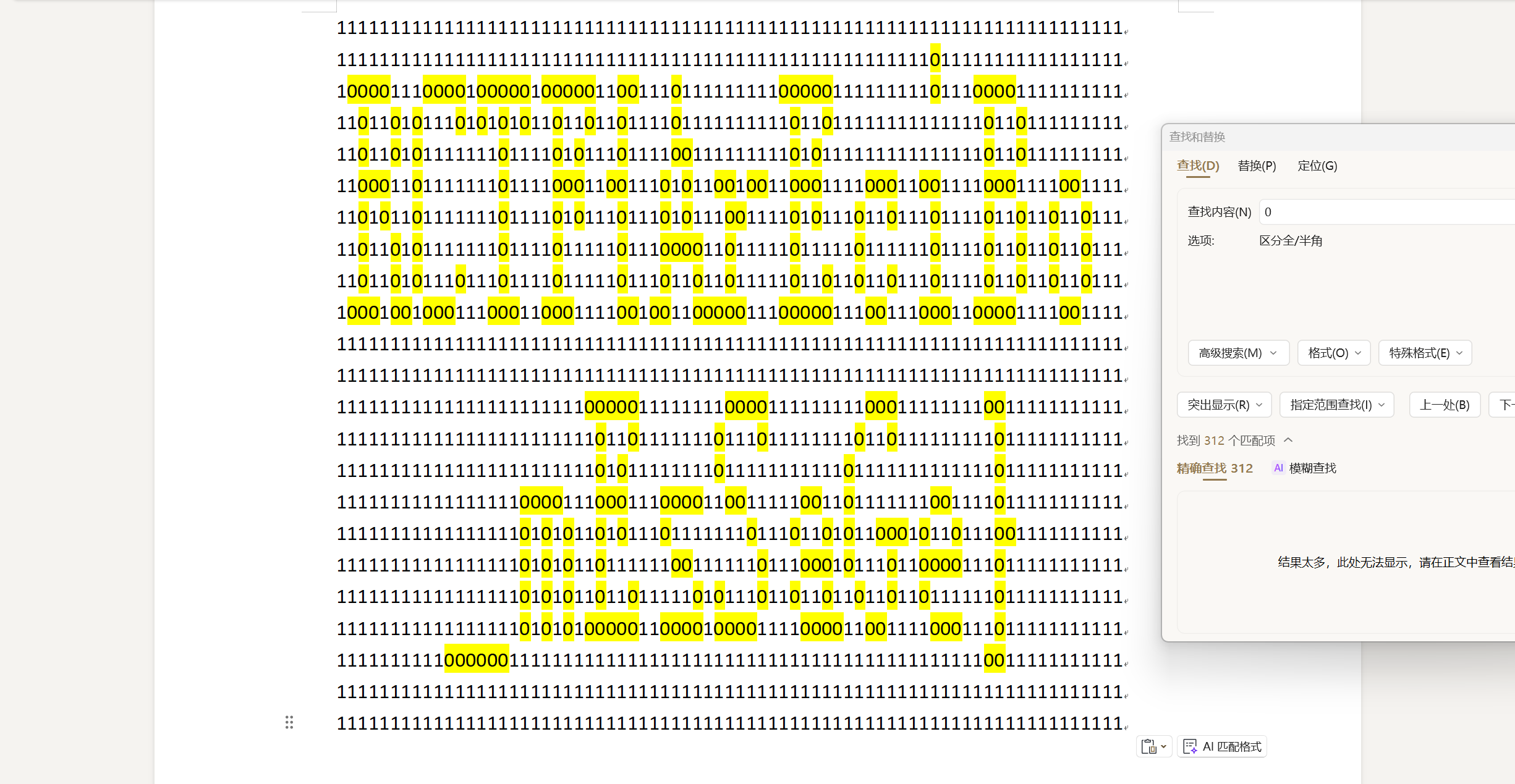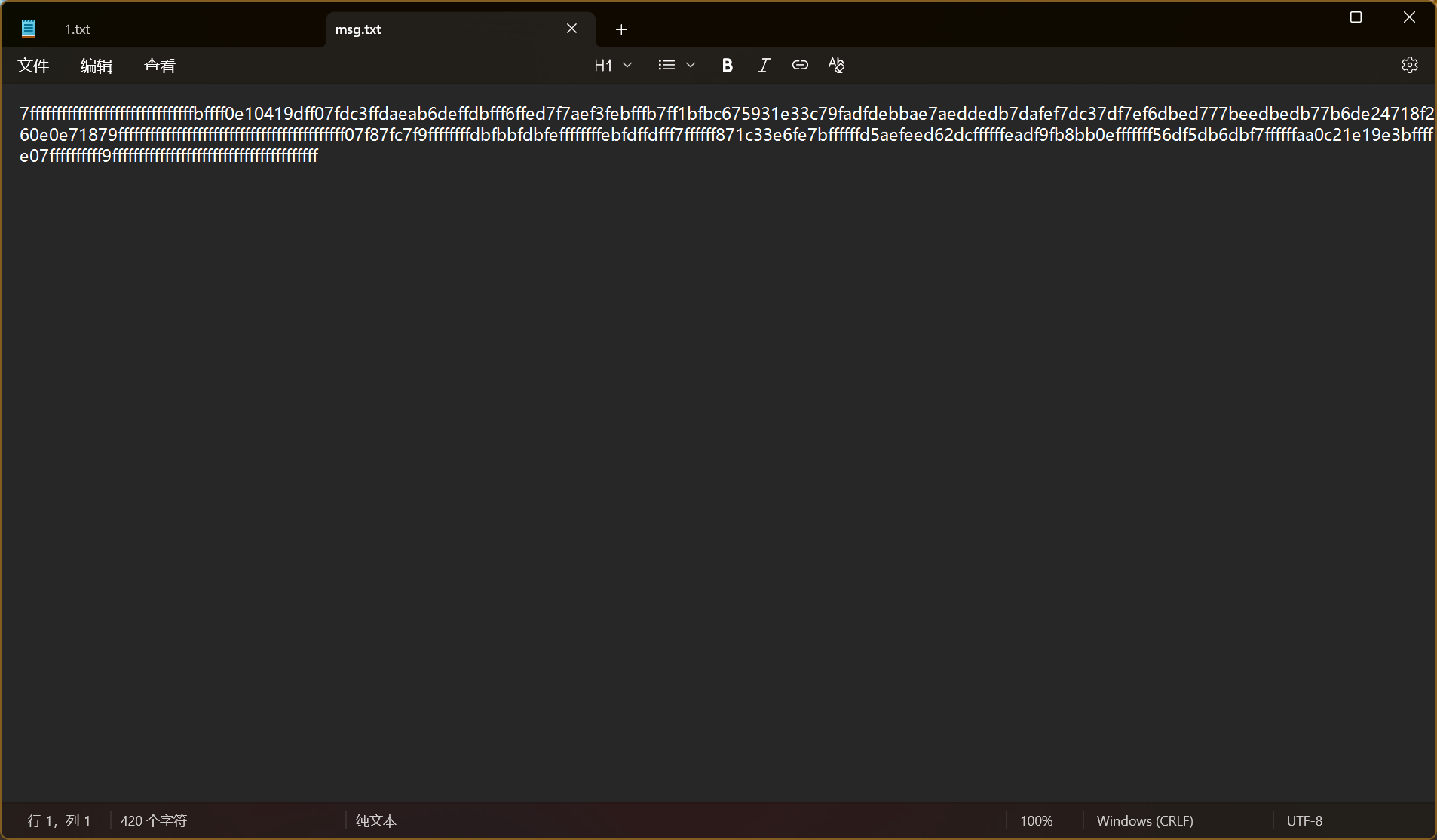 拿到附件后有一个文本 看着像16进制字符 把16进制转为2进制bin文件看看有没有藏东西 工具 什么都没有 文件一般以2进制形式进行传输保存 反转2进制再生成为bin文件观察一下 成乱码了 这里猜测也许是2进制字符串隐写 网站 把未反转的2进制字符串用word打开 并且高亮0 观察到这里似乎有字符,但是没有排列好 统计字符数并进行因式分解 工具 常见的排列一般都以因式分解后的结果进行行数分配 尝试选取最高数(73)为行数进行排列 并且高亮0 然后就能看见flag了 (近视的可以尝试脱下眼镜看,有奇效) RCTF{ArEciBo_mEsSaGe}