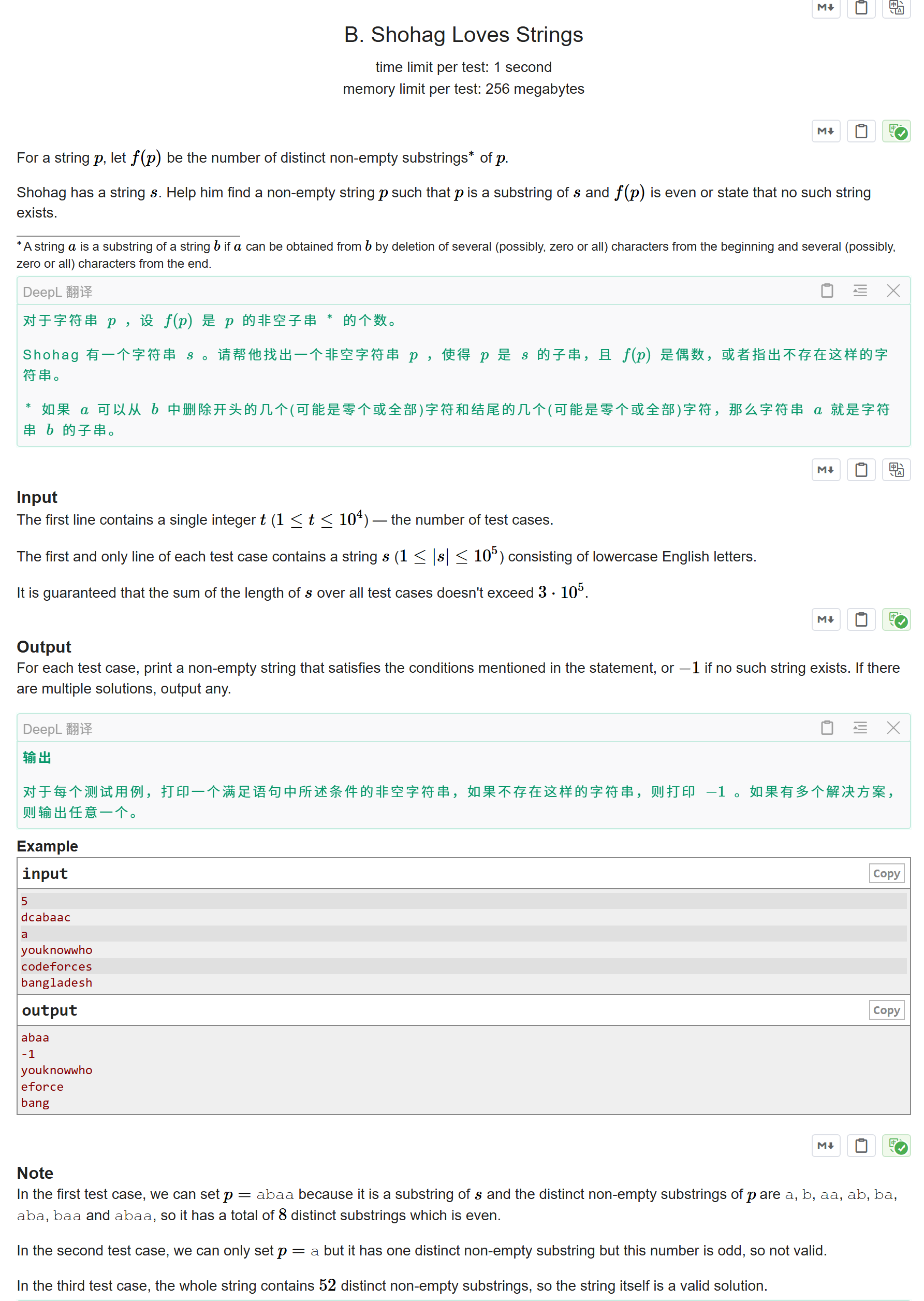 若 p 的长度为 m,那么它的所有非空子串个数为:f(p)=(m*(m+1))/2,这是求非空子串的公式,因为要求f(p)为偶数,并且只需要输出任意一个解决方案,那这个问题我们就可以特殊化一下。