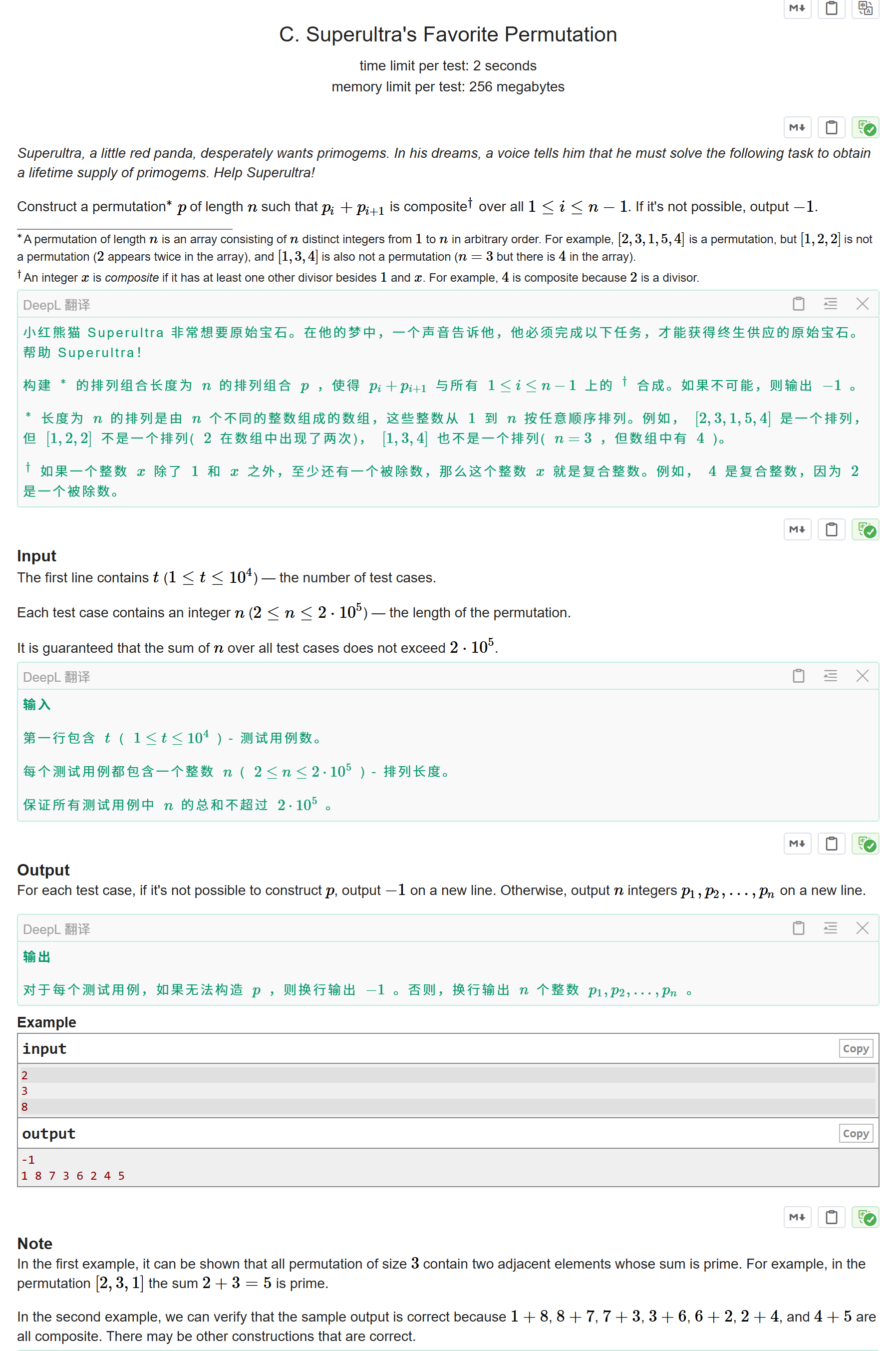 我们需要构造一个长度为 n 的排列 p,使得对于任意相邻两项 pi+pi+1 都是合数