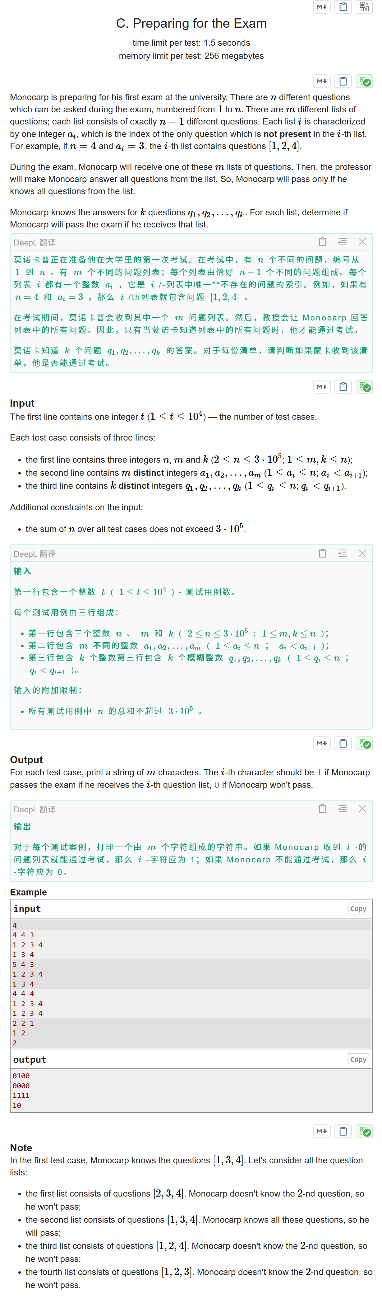 首先设 Monocarp 已知答案的问题集合为 Qknown={q1,q2,…,qk},然后设第 i 个列表包含的问题集合为: