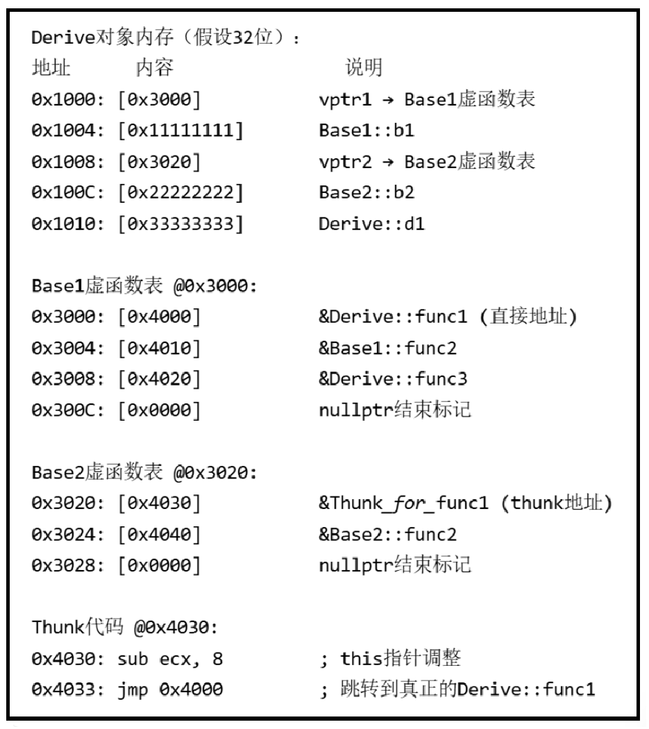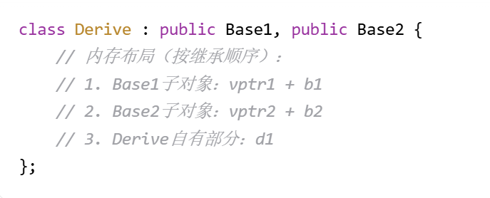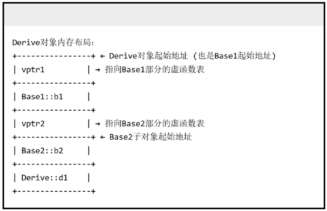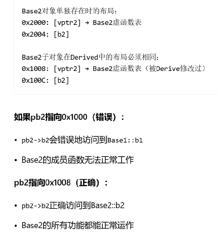 编译器在类型转换时自动调整指针,确保每个基类指针都指向对应的完整子对象,这是多继承能够正常工作的基础机制。