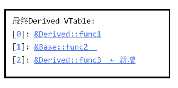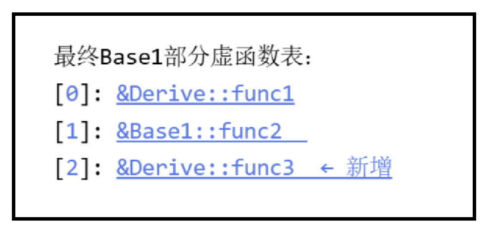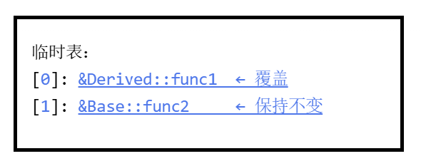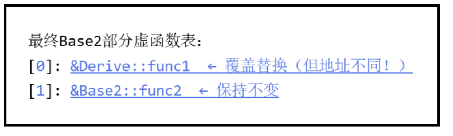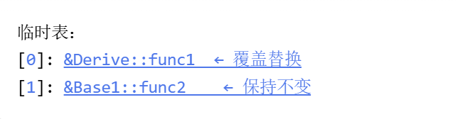 覆盖重写的函数:Derive重写了func1,用&Derive::func1替换索引0的位置