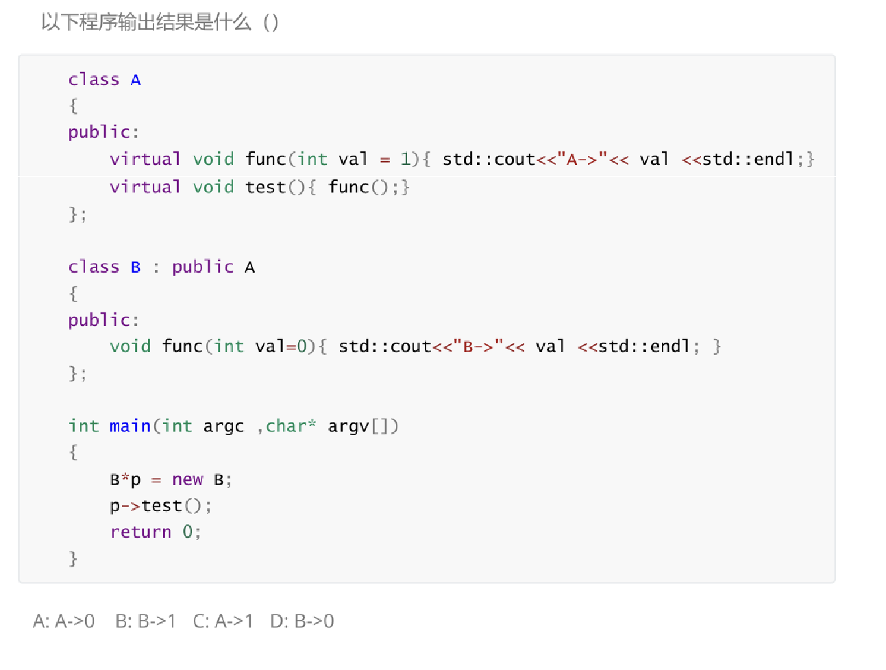 p是B*类型,p指向test(),重点在于test虚函数调用的是哪一个func() ?