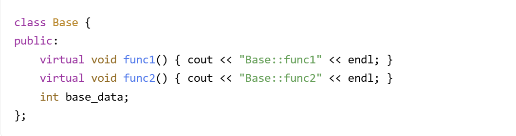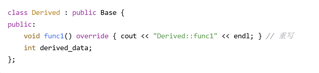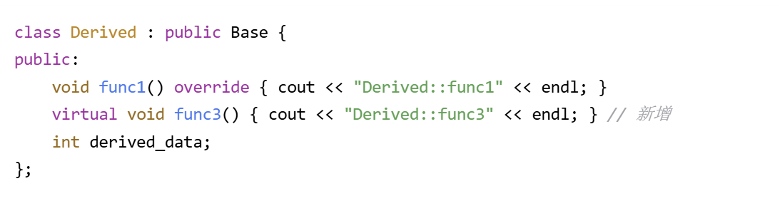 virtual void func3() { cout << "Derive::func3" << endl; }