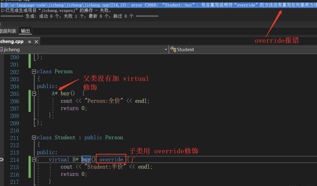 2. override: 检查派生类虚函数是否重写了基类某个虚函数,如果没有重写编译报错
