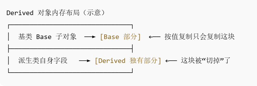 切片是指:当你把“派生类对象”按值拷贝/赋值给一个基类对象时,只会拷贝“基类那一部分”的数据和行为,派生类独有的那部分被丢掉了。结果就是:接收者变成了一个纯粹的基类对象,它的动态类型就是基类,因此多态失效。