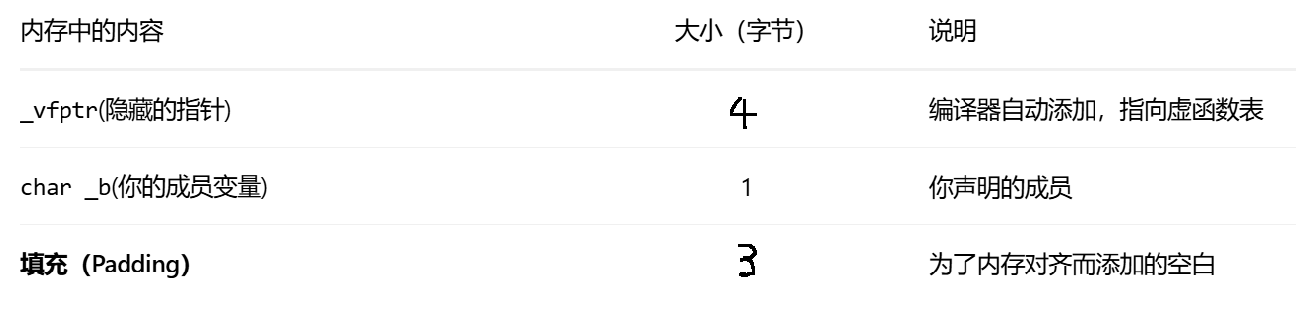 对象大小 = 所有基类大小 + 派生类成员大小 + 虚表指针